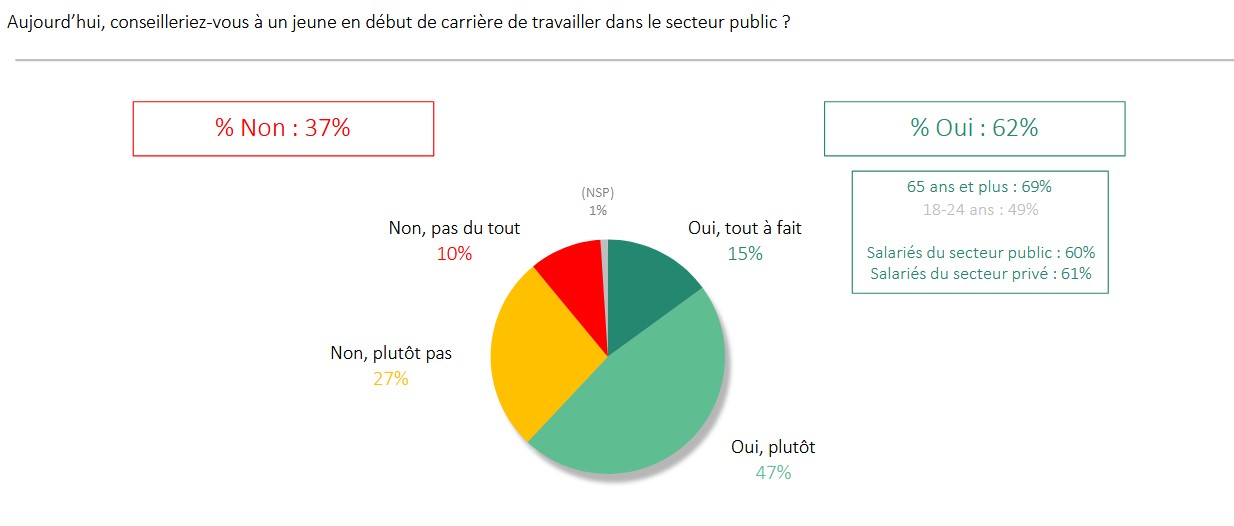 Malgré le diagnostic critique sur l’évolution de la qualité, 62 % des Français conseilleraient toujours à un jeune en début de carrière de travailler dans le secteur public, contre 37 % qui ne le feraient pas. « La recommandation demeure donc majoritaire. Mais le clivage générationnel est très marqué », fait savoir Odoxa. « Parmi les plus jeunes, seuls 49 % conseilleraient cette orientation, soit seulement près d’un sur deux. »