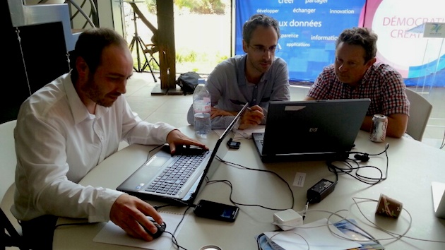 Sur place, Brice code un moteur de recherche pour les marchés publics du CG71, Samuel et Daniel échangent sur eBourgogne. “Il faudrait deux niveaux d’accès aux données, précise Samuel, en fonction du caractère confidentiel de la donnée : une couche en open data et une autre réservée aux administrations autorisées, par exemple les rapports d’analyse des offres.”