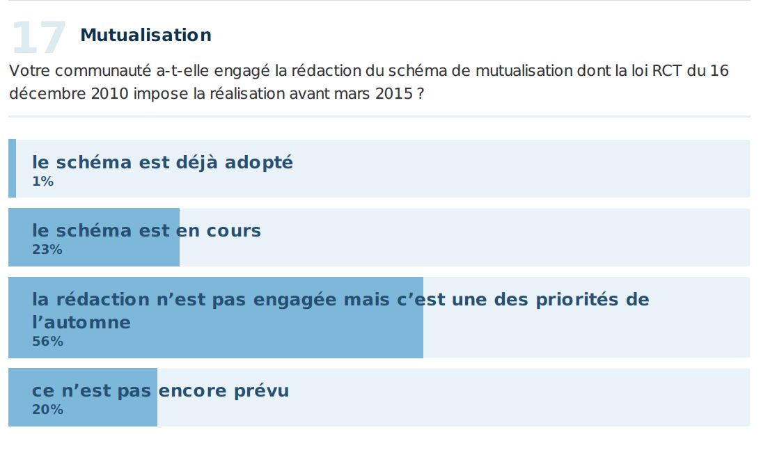 Alpha et oméga du débat public, la mutualisation entre les intercommunalités et leurs communes membres tarde à se traduire dans les faits. Selon l’enquête de l’ADCF, 1 % des communautés a déjà adopté un schéma en ce domaine. Un dispositif pourtant obligatoire avant mars 2015, selon la loi portant réforme des collectivités territoriales du 16 décembre 2010. 56 % des présidents d’intercommunalité indiquent que la rédaction d’un tel document n’est pas engagée, mais qu’elle constitue l’une des priorités de l’automne. 20 % précisent que rien n’est encore prévu.