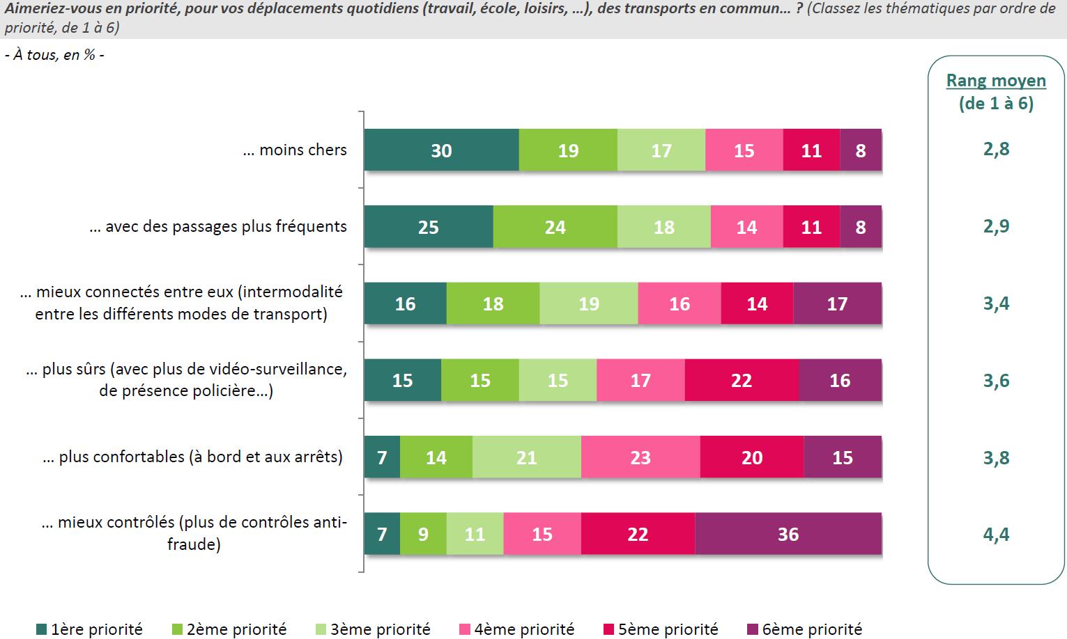 Même si les Français ont conscience que la voiture individuelle leur coûte plus cher que les transports publics – mais sous-évaluent largement ce surcoût –, ils n’en réclament pas moins une baisse du prix de ces derniers : pour la moitié des personnes interrogées, des transports collectifs « moins chers » constituent la première (30%) ou la seconde priorité (19%) pour les déplacements quotidiens. Viennent ensuite « des passages plus fréquents » (classé en 1ère priorité par 25% du panel), puis l’intermodalité (16%) et la sécurité (15%). L’amélioration du confort, à bord et aux arrêts, et l’augmentation des contrôles anti-fraudes, arrivent bons derniers : 7% seulement des Français les classent l’un ou l’autre en première priorité.