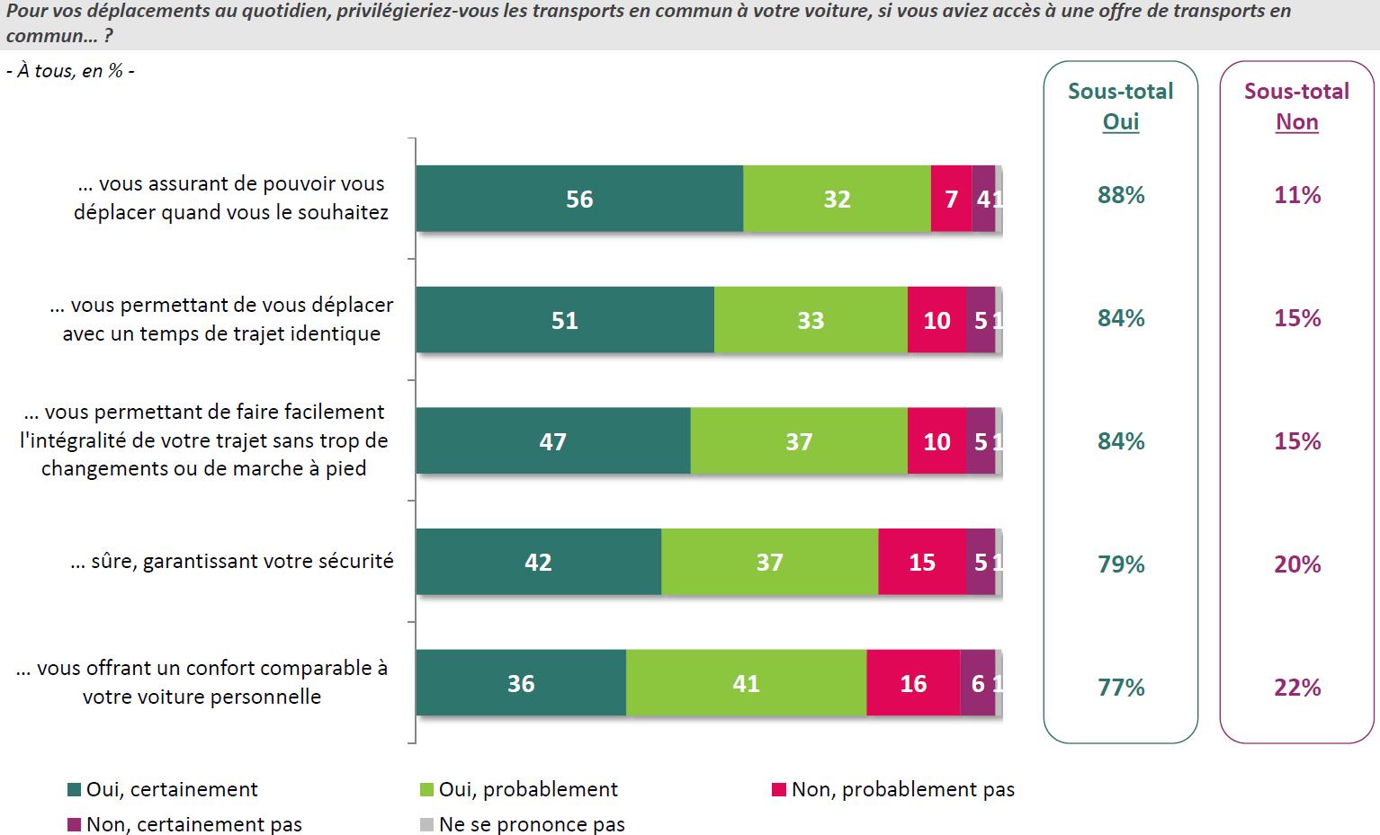 Le sondage s’intéresse également aux leviers les plus efficaces pour favoriser le report modal. Il en ressort que 88% des Français privilégieraient « certainement » (56%) ou « probablement » (32%) les transports en commun à leur voiture pour leurs déplacements quotidiens s’ils leurs assuraient « de pouvoir se déplacer quand ils le souhaitent ». Le cadencement des réseaux apparait donc comme un facteur de progrès de la part modale du transport public, en tout cas si l’on se fie aux déclarations d’intention des sondés. Plus de la moitié de ces derniers (51%) assurent également que si le temps de trajet était identique, ils utiliseraient « certainement » davantage les transports en commun. Cela étant, comme le souligne les auteurs de l’étude, « rien ne permet de déterminer si les personnes interrogées n’ont pas […] déjà accès à une offre de transport en commun de même durée qu’un trajet en voiture »…