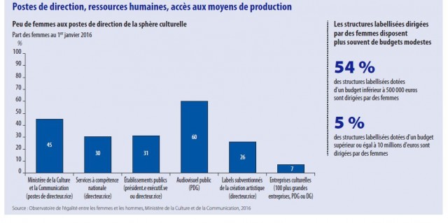Au 1er janvier 2016, les inégalités entre les femmes et les hommes sont encore, hélas, bien présentes. Les femmes sont beaucoup moins nombreuses que les hommes à la tête des lieux de création et de diffusion du spectacle vivant, particulièrement dans les scènes de musiques actuelles, les opéras et les centres chorégraphiques nationaux. Pire, plus les budgets des structures aidées sont importants, moins on trouve de femmes à leur tête… Elles sont moins programmées, en musique, danse et théâtre, et dans les expositions d’art plastique. Les oeuvres des femmes sont moins présentes dans les FRAC et au FNAC, et moins de films de femmes que d’hommes accèdent à l’avance sur recettes.