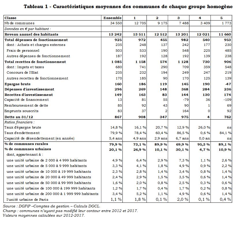 Il en ressort cinq classes homogènes de communes, à l’intérieur desquelles « les communes se ressemblent et adoptent des choix budgétaires et financiers similaires ». Voici la typologie établie, sur la base de ce tableau :