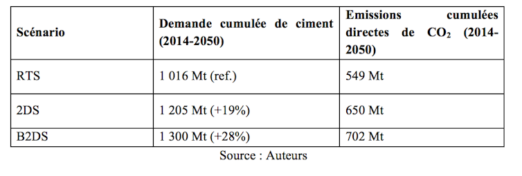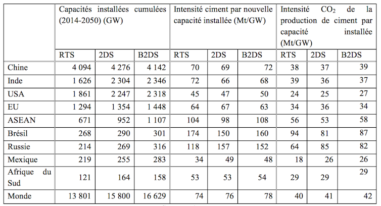 Les émissions de CO2 liées à la production de ciment pour le secteur électrique sont également négligeables au regard de la baisse des émissions attendues grâce au nouveau parc électrique mondial composé d’énergies renouvelables. Le ciment ne devrait donc pas limiter le déploiement des nouvelles capacités nécessaires aux trois scénarios proposés par l’AIE.