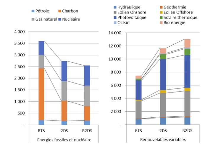 Il faut également prendre en compte la durée de vie plus courte des installations renouvelables – 25 ans en moyenne pour l’éolien et le solaire contre 35 ans en moyenne pour les centrales thermiques traditionnelles, et leur démantèlement. On peut alors déduire la somme des capacités à installer d’ici à 2050 pour répondre au besoin des scénarios de l’AIE.