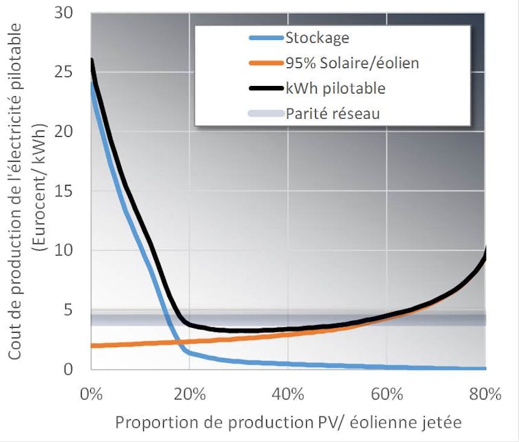 Ayant conduit des recherches sur le sujet – en particulier aux États-Unis pour le ministère de l’Énergie – nous affirmons qu’une énergie renouvelable pilotable est possible, et à un coût abordable. Une idée très ancrée est de considérer que toute la puissance générée par le renouvelable doit être vendue puisqu’elle a été produite. Mais jamais n’est évoquée l’idée de « gaspiller » de l’énergie solaire ou éolienne. Par conséquent, on n’envisage pas la possibilité de surdimensionner et réduire proactivement l’énergie électrique produite. Concrètement, l’idée est d’installer le renouvelable en quantité dépassant la demande : un jour de beau temps pour le solaire, on surproduira. Le surplus produit en conditions favorables étant soit stocké, soit jeté, selon le coût optimal.