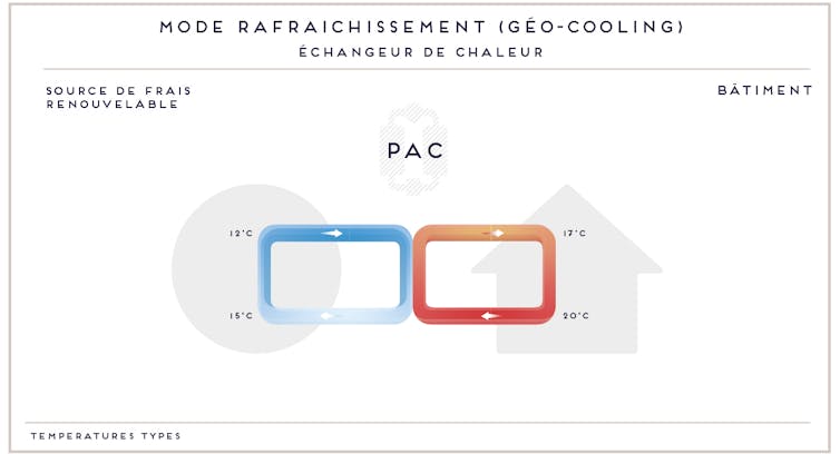 Sous réserve de disposer d’émetteurs adaptés, c’est le même système géothermique, équipé d’une pompe à chaleur réversible, qui produit du froid actif et du chaud.