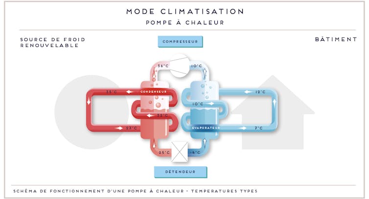 La première consiste à prélever la chaleur du bâtiment via l’évaporateur. Le compresseur rehausse ensuite le niveau de température afin d’évacuer cette chaleur, par échange avec le sous-sol, frais.