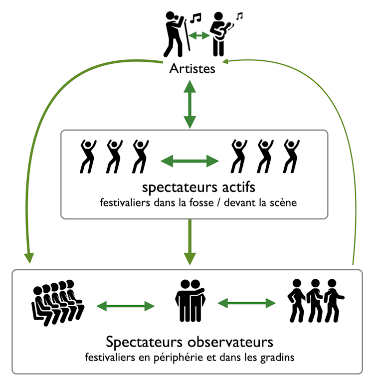 Si l’importance des échanges émotionnels entre les artistes et le public a été étudiée et validée, l’analyse globale de l’expérience émotionnelle des festivaliers montre que ces dynamiques touchent aussi l’ensemble des acteurs de l’événement. Le schéma suivant présente une modélisation des transferts d’émotions (flèches vertes) entre l’ensemble des acteurs du spectacle, notamment les festivaliers entre eux, dont certains ont un rôle d’émetteur d’émotions très marqué.