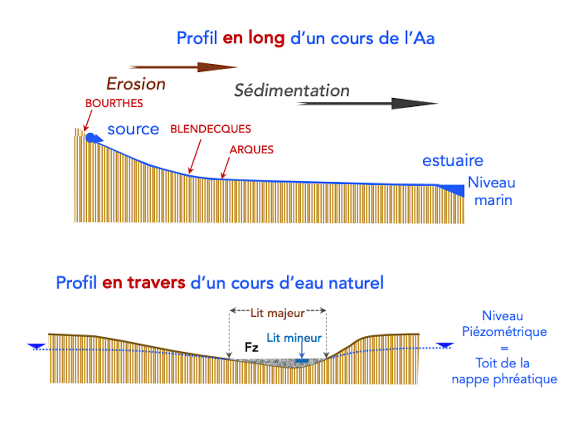 Profils en long et en travers de l’Aa : la partie amont, à pente raide, collecte l’eau de sources qui déterminent des ravines à écoulements épisodiques : l’érosion domine. La partie avale, très faiblement inclinée, toujours en eau, est le domaine de la sédimentation : les sédiments arrachés à l’amont s’étalent et forment les couches d’alluvions. Leur extension détermine le lit majeur qui délimite les zones potentiellement inondables. Le lit mineur est le conduit d’écoulement permanent.