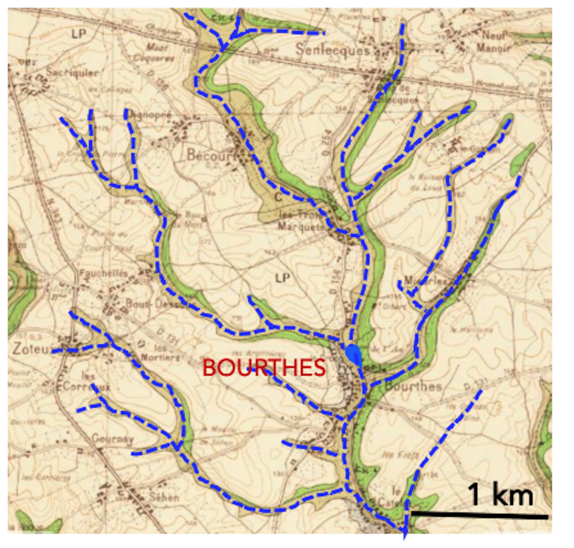 Bourthes est le point de convergence des ravines qui collectent les ruissellements. Le village est localisé à partir du point d’écoulement permanent historique.