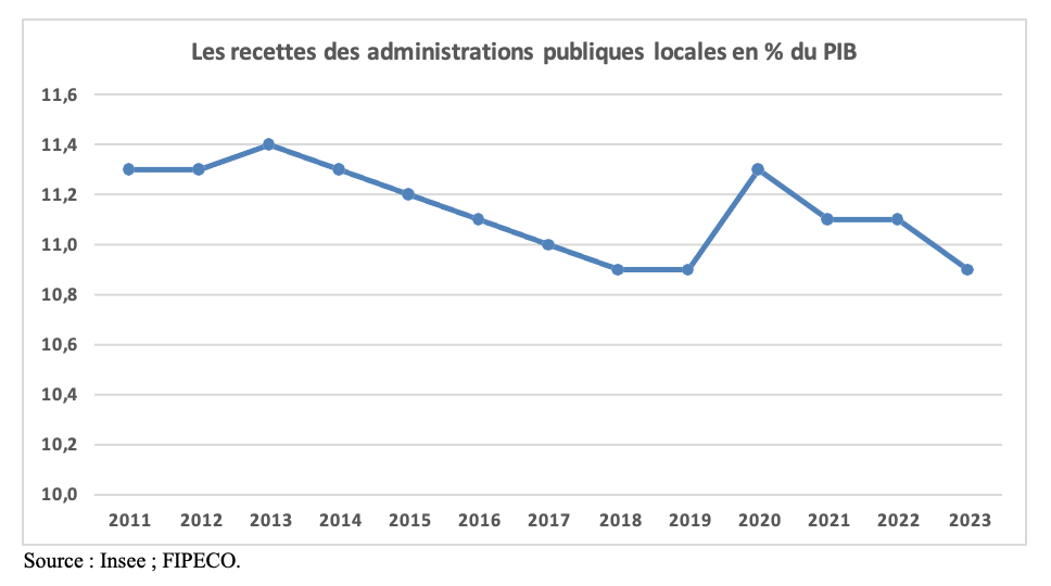Les recettes des APUL se sont élevées à 305 milliards d’euros en 2023 et leur croissance a été de 4,0 %, inférieure à celle du PIB en valeur (6,2 %). Elles ont donc diminué en pourcentage du PIB, de 11,1 % en 2022 à 10,9 % en 2023.