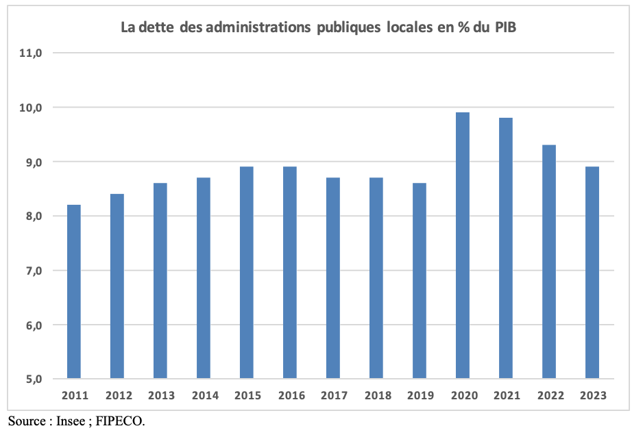 La dette des APUL s’élevait à 250 milliards d’euros à la fin de 2023 (245 milliards d’euros à la fin de 2022). En pourcentage du PIB, elle est passée de 9,3 % fin 2022 à 8,9 % fin 2023. La société du Grand Paris et Ile-de-France mobilités ont contribué à l’accroître à peu près autant que les collectivités locales.