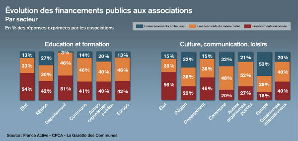 Réalisée en ligne entre septembre et novembre 2011 auprès de 877 associations, l’enquête met en évidence que 69 % des associations interrogées ont vu au moins un de leurs financements publics baisser. Sans surprise, les subventions de l’Etat sont les plus concernées, puisque 56 % des associations sont touchées. Mais les collectivités territoriales marquent aussi le pas : 35 % des associations sont impactées par une baisse.